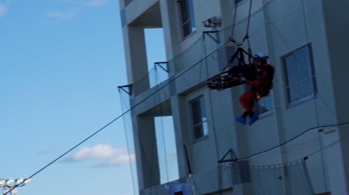 消防署の協力を得て、校舎内に逃げ遅れた生徒がいたとの設定で救助の実演がありました。
